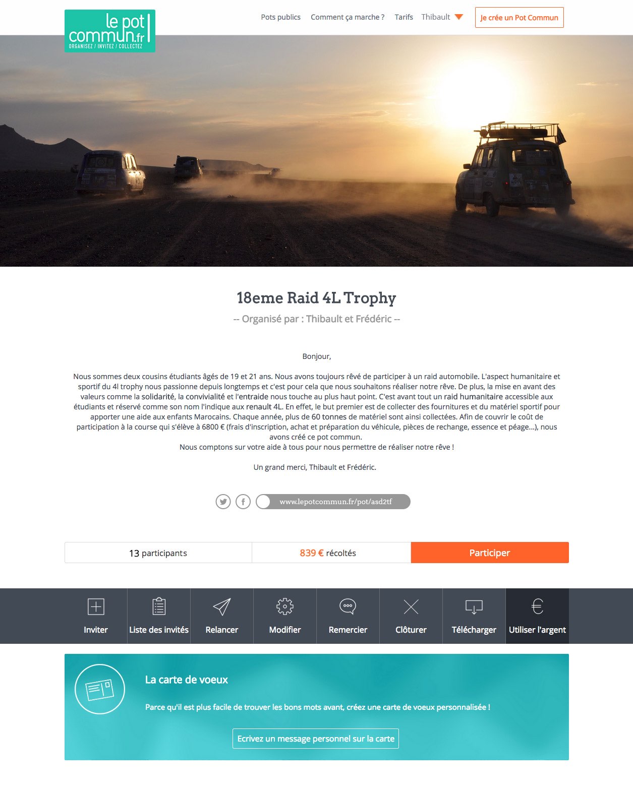 Le Pot Commun.fr est le service le plus adapté pour la récolte de dons. En permettant aux membres de votre association de participer en ligne, vous simplifiez la démarche et vous accélérez votre collecte. Vous suivez en direct l’évolution de votre campagne, le montant récolté et vos relances afin d’obtenir le maximum de dons possible. Vous pouvez choisir de rendre publique votre collecte de dons en ligne, cela vous permettra de placer des liens depuis vos pages internet, blog, forum vers votre pot commun, afin de le rendre populaire et d’obtenir un maximum de dons. Collecter vos dons à l'aide notre service en ligne, ça peut vous changer la vie !