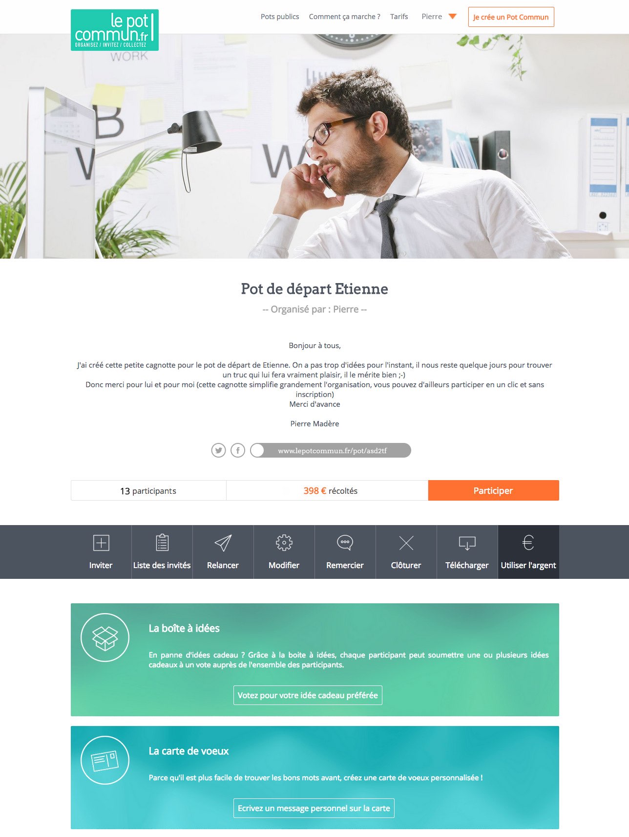 Organiser un pot de départ prend toujours du temps, surtout lorsqu’il faut récolter les participations auprès de toutes les personnes de votre équipe. Le Pot Commun.fr rend les choses beaucoup plus faciles, si vous êtes chargé de l’organisation de l’événement. Le principe : inviter l’ensemble des participants sur Internet, via la page du pot commun que vous aurez créé et personnalisé pour l’occasion. C’est particulièrement pratique dans le cadre d’une entreprise car il vous sera facile d’établir votre liste d’e-mails. A la fin de la collecte, vous recevrez le montant de la cagnotte directement sur votre compte bancaire. Vous pouvez dès lors commander un cadeau sur Internet ou vous rendre dans un magasin. Organiser un pot de départ avec notre collecte en ligne, c’est magique !